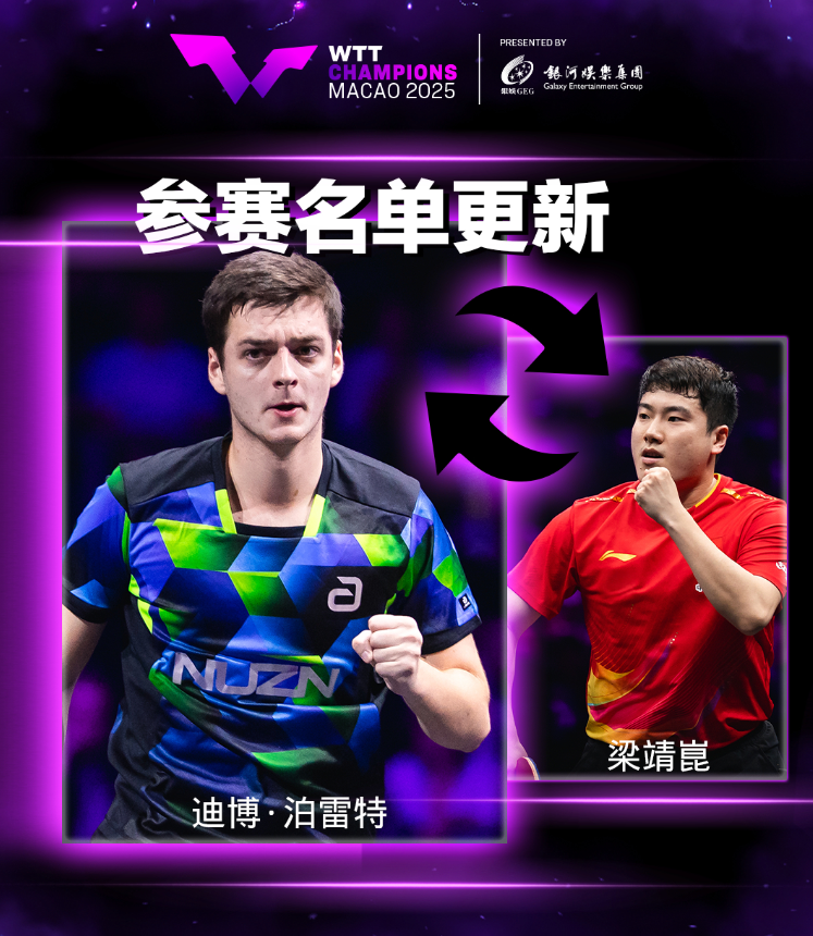 2025年WTT澳门冠军赛定于9月9日-14日举办,本站比赛设置男女单打两个项目,总奖金80万美元。目前距离比赛开始还有2天多时间,突发消息:国乒世界冠军梁靖崑退赛,来自法国的乒乓球运动员迪博·泊雷特替补出战。